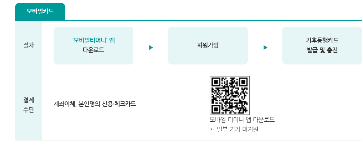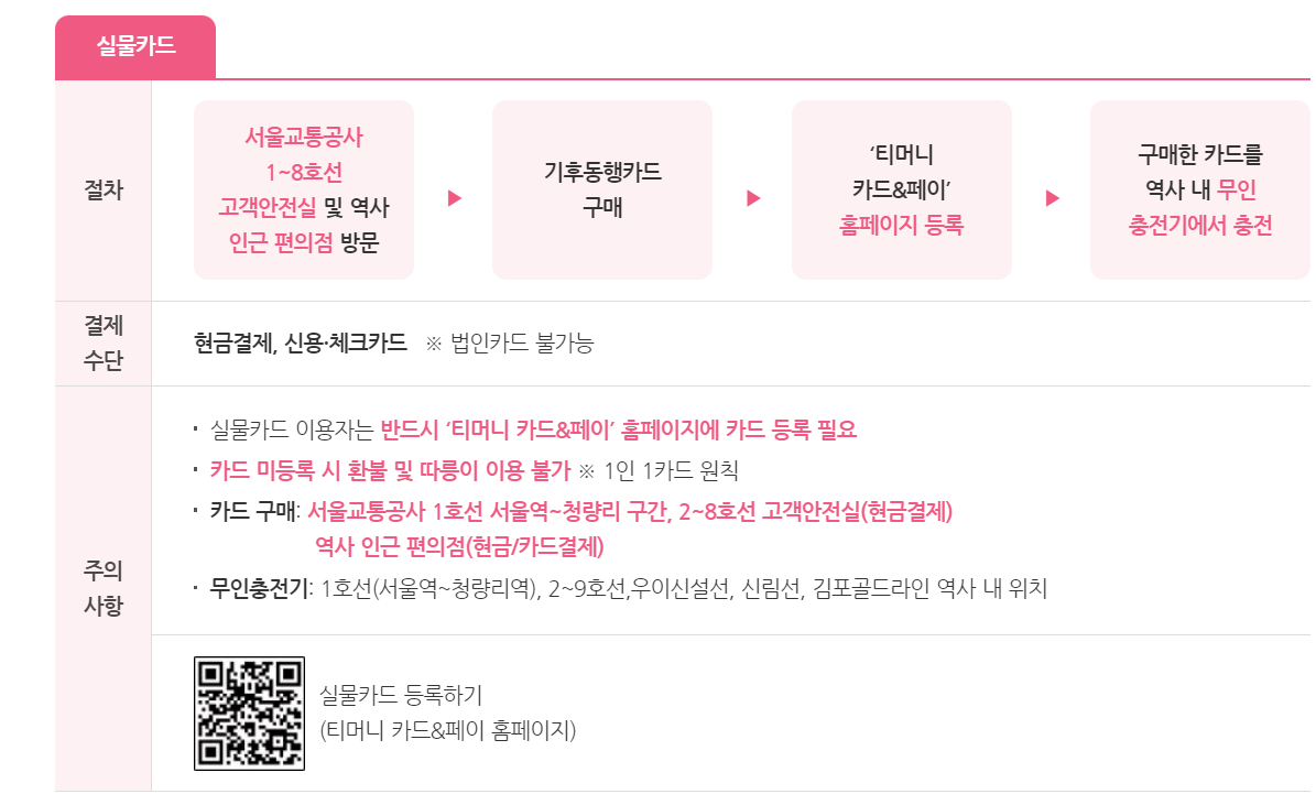 - 실물 카드: 반드시 티머니 홈페이지에서 카드번호 등록 필수!