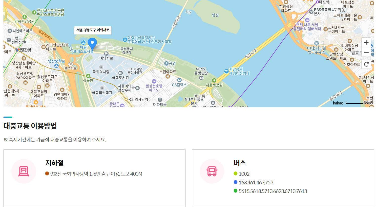 - 지하철: 5호선 여의나루역(1번 출구), 9호선 국회의사당역(3번 출구)