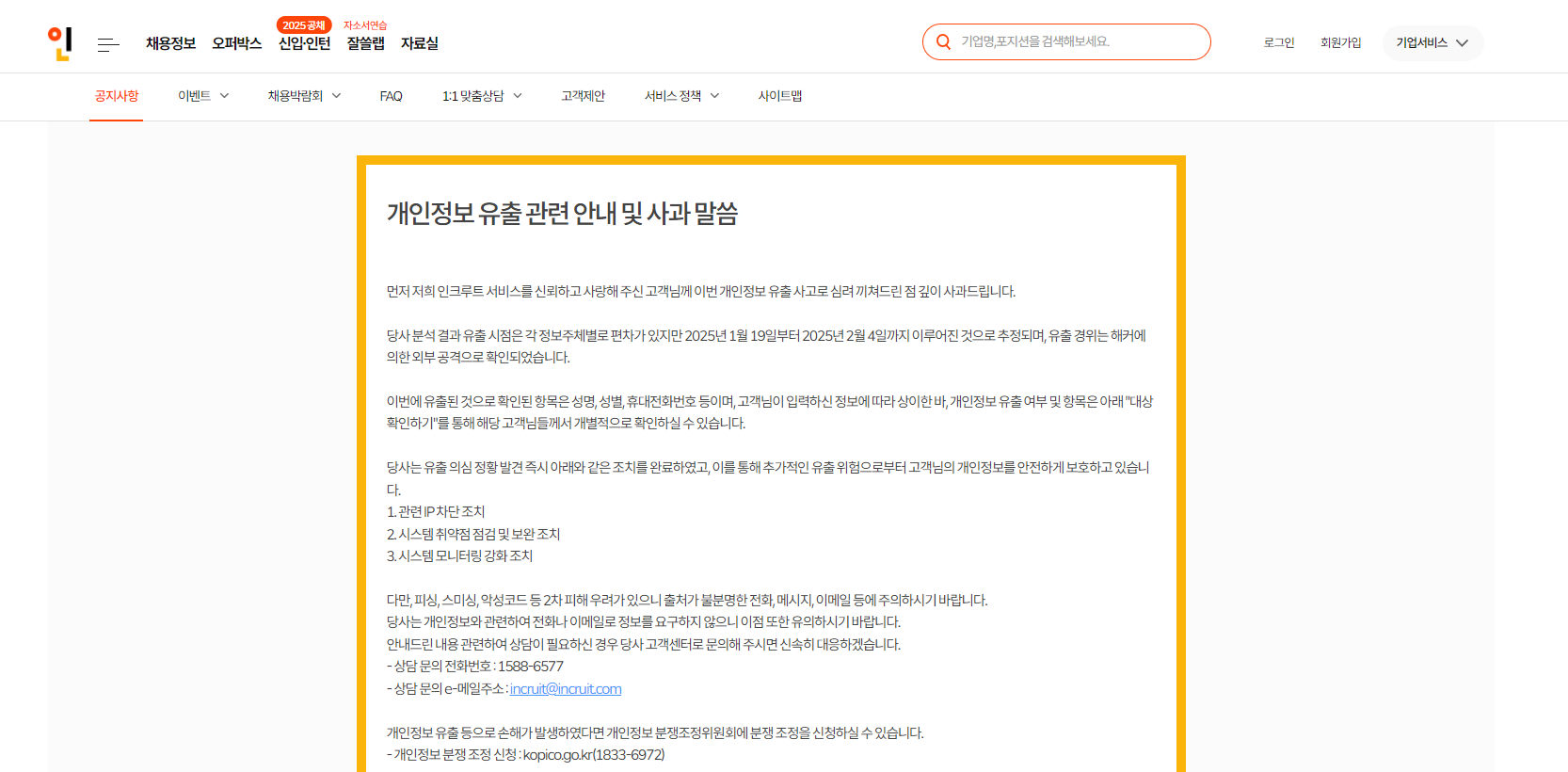 2025년 1월 19일부터 2월 4일까지 약 2주간 인크루트 서버에 외부 해커의 공격이 있었습니다. 이 해킹으로 성명, 성별, 휴대전화번호 등 개인정보가 유출되었습니다.